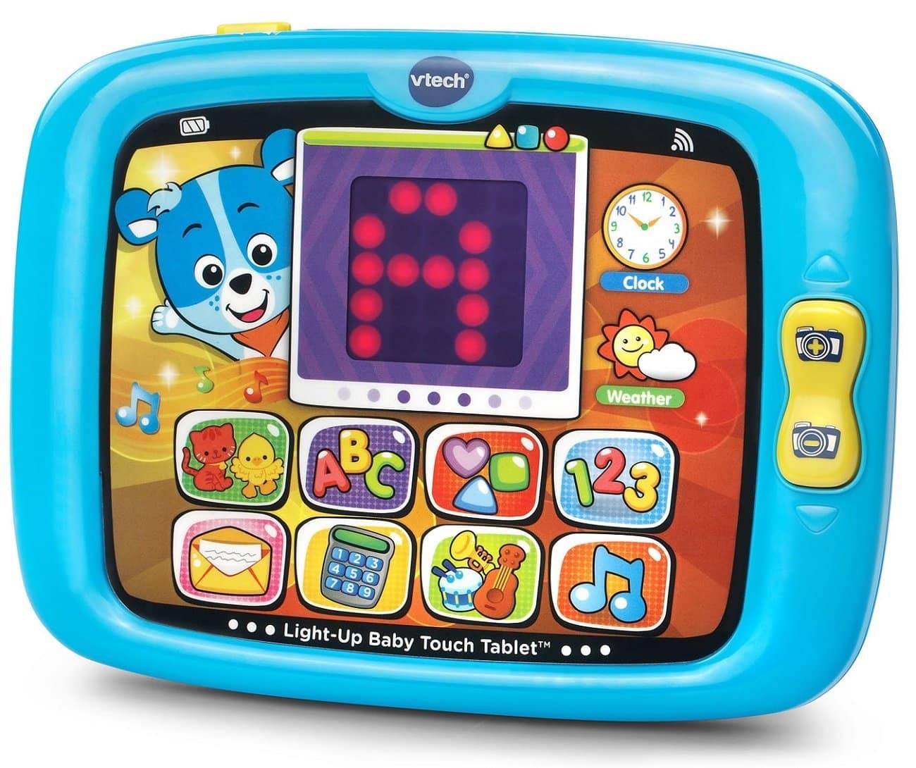 Learn letters, numbers, shapes and more on the light-up baby touch tablet from VTech. This tablet encourages imaginative play and includes more than 10 apps and activities for your child to explore. Pressing the eight learning app buttons introduces your child to letters, shapes, counting, numbers, instruments, animals, first words and music. Your child can also explore special apps and open pretend e-mails, take pretend pictures or check the time and weather just like mom and dad. The interactive light-up screen allows your child to use their finger to swipe the screen left, right, up or down to see the previous or next screen. They can also tap on Cody to interact with him and say “hi”! tap, swipe and learn with Cody the smart Cub!