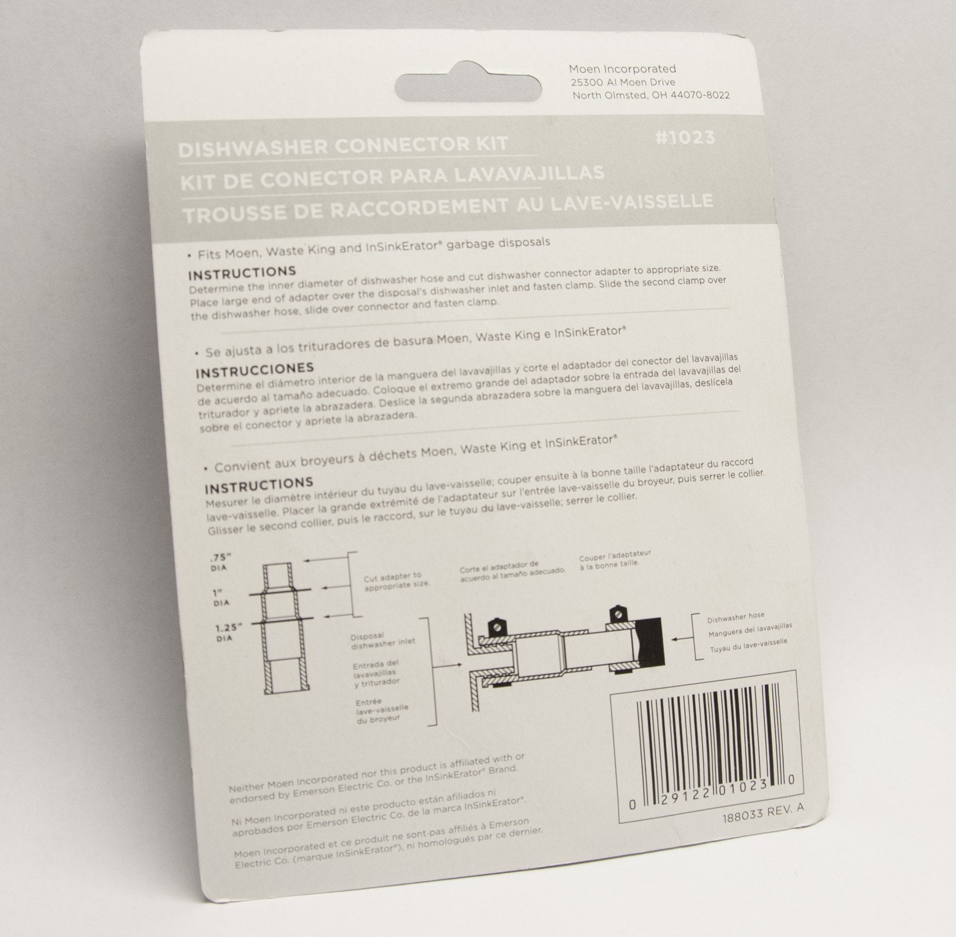 - Connects 1-1/4″, 1″ and 3/4″ outside diameter dishwasher drain hoses to the 1-1/2″ garbage disposal dishwasher inlet