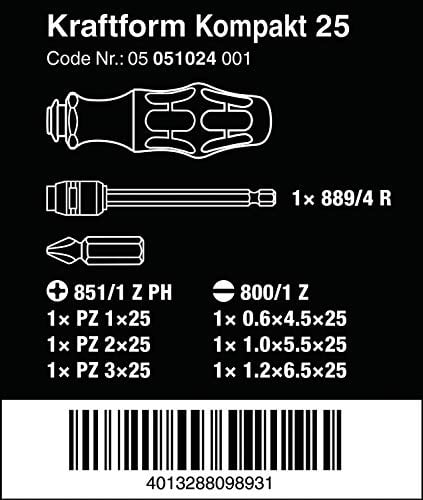 Wera 7 in 1 Kraftform Kompakt 25 multi-tool is designed as the compact tool for manual or machine use. The two-position telescopic blade retracts into the handle for easy screw-driving in the tightest spots. With quick push of clamping sleeve the bayonet blade extends into full-sized screwdriver. Bayonet blade can be removed and attached to a power tool as a bit holder. Rapidaptor with quick-release chuck allows for quick one-handed bit insertion and removal for insert and power bits. Integrated bit storage, with press-button opening, makes tool adjustments quick and effortless. German Engineered. KK25 contains Kraftform Screwdriver with integrated bit storage and bayonet blade with Rapidaptor quick-release chuck, 3 Slotted bits – 9/64?, 7/32?, 5/16?; 3 Phillips – PH1, PH2, PH3. Includes durable belt pouch for transport and storage. Wera ? The Best Tools For The Job!