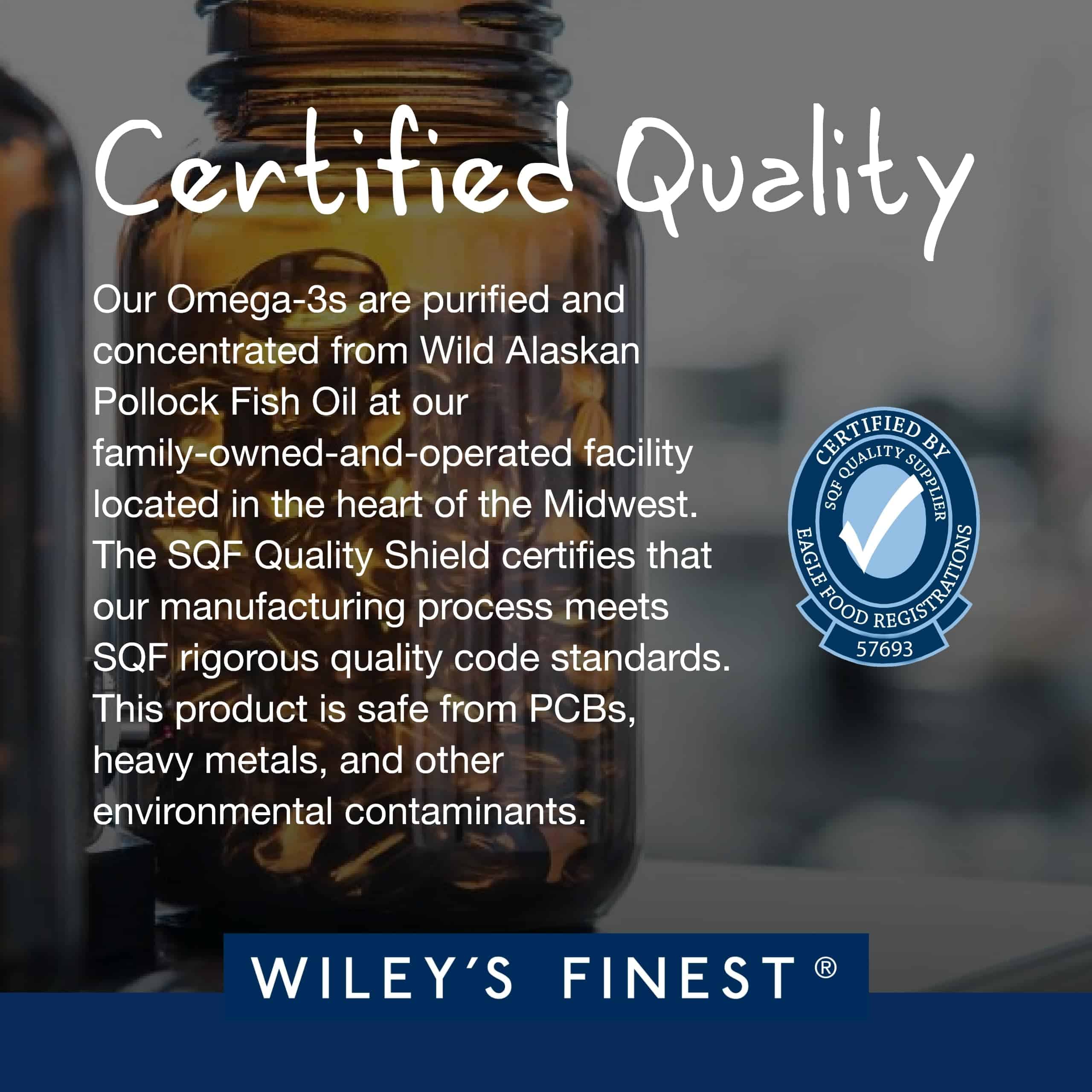 100% SATISFACTION GUARANTEE Our distillation process reduces or eliminates fishy burps, unpleasant aftertaste, fishy odour or lingering fishiness. For even more fish-odour fighting, refrigerate! Do you have an extra sensitive nose or stomach? Fight fish odour even more by keeping your liquid in the refrigerator, and always take with a meal. While no fish oil is 100% burpless, we are proud of the extremely mild, bland taste of our fresh, clean, exceptional quality fish oils. All ingredients are the highest quality, non-GMO, gluten-free, dairy-free, and grain-free with no artificial flavours, colours or preservatives. Our products are tested by a third party, NSF Contents Tested & Certified pure of heavy metals including Mercury, PCBs, Lead, Cadmium, and Arsenic. Wiley?s Finest all natural Omega-3 Fish Oil products are made in America from sustainable wild-caught Alaska Pollock (Gaduschalcogrammus) and purified and packaged at our family owned and operated facility in Ohio. Certified by the Marine Stewardship council to be sustainably and responsibly caught, Alaska Pollock is considered the most well managed large-scale fishery in the world. Most other fish oil supplements sold are produced from anchovy oil caught in Peru, rendered and shipped to ingredient manufacturers in other South American countries, China, Korea, or Europe, and finally encapsulated in the USA. Our Wild Alaskan Fish Oil is completely different! *This statement has not been evaluated by the Food and Drug Administration. This product is not intended to diagnose, treat, cure, or prevent any disease.