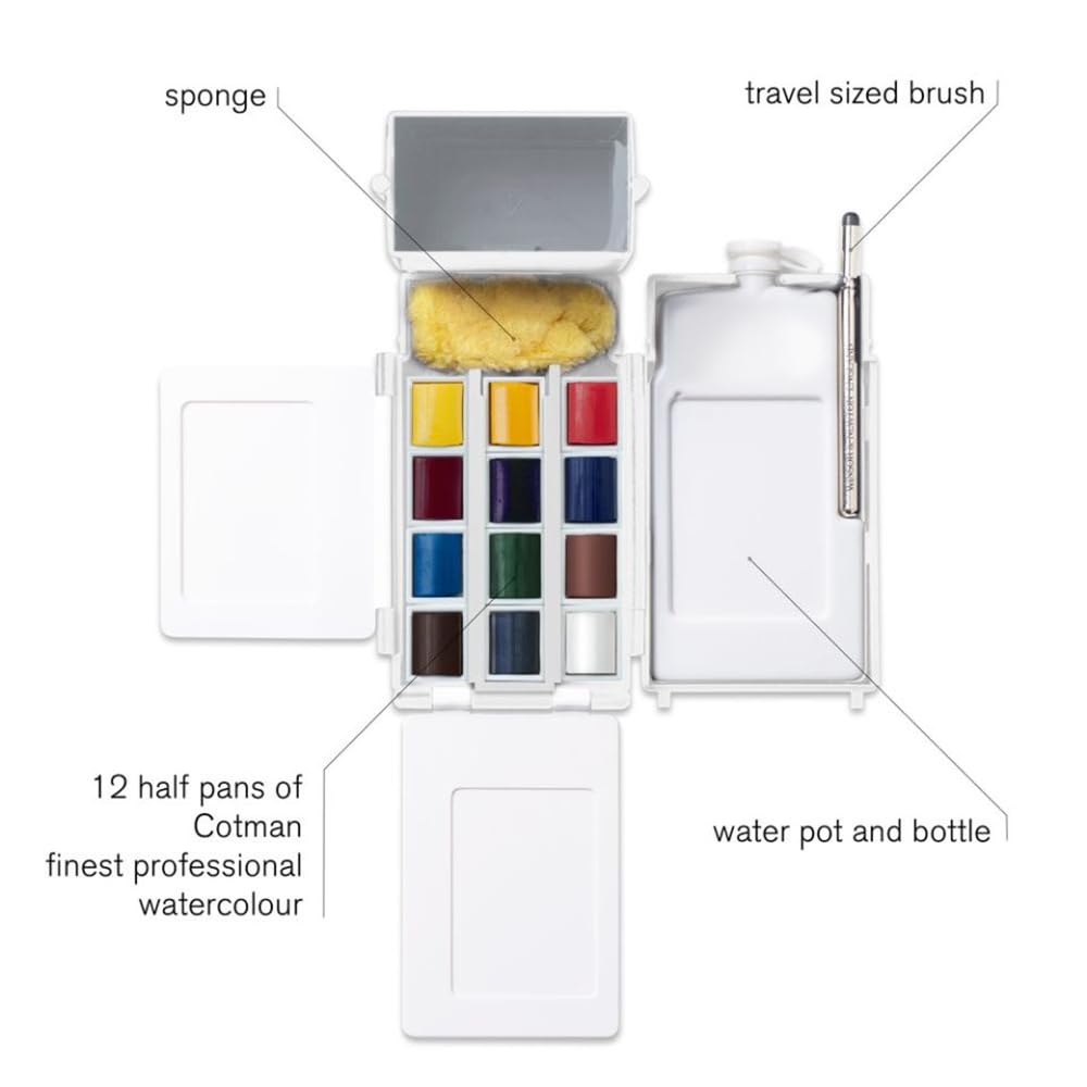Winsor & Newton Cotman Water Colors are a range of water colors that are made to our normal high quality standards but costs are kept to an economical level by replacing some of the more costly pigments with less expensive alternatives. Each color has good transparency, excellent tinting strength and good working properties. This exclusive compact Field Box has been designed to be light-weight and fit snugly into the pocket while providing everything required for successful outdoor water color painting. Constructed in durable blue plastic, the Field Box includes: 12 Cotman Water Color half pans, a pocket brush, artists’ sponge, 3 mixing areas, 35ml capacity water bottle, clip-on water container and an instructional leaflet. Colors included: Cadmium Red Pale Hue, Cadmium Yellow Hue, Cadmium Yellow Pale Hue, Alizarin Crimson Hue, Ultramarine, Cobalt Blue Hue, Sap Green, Viridian Hue, Burnt Umber, Yellow Ochre, Burnt Sienna and Chinese White.