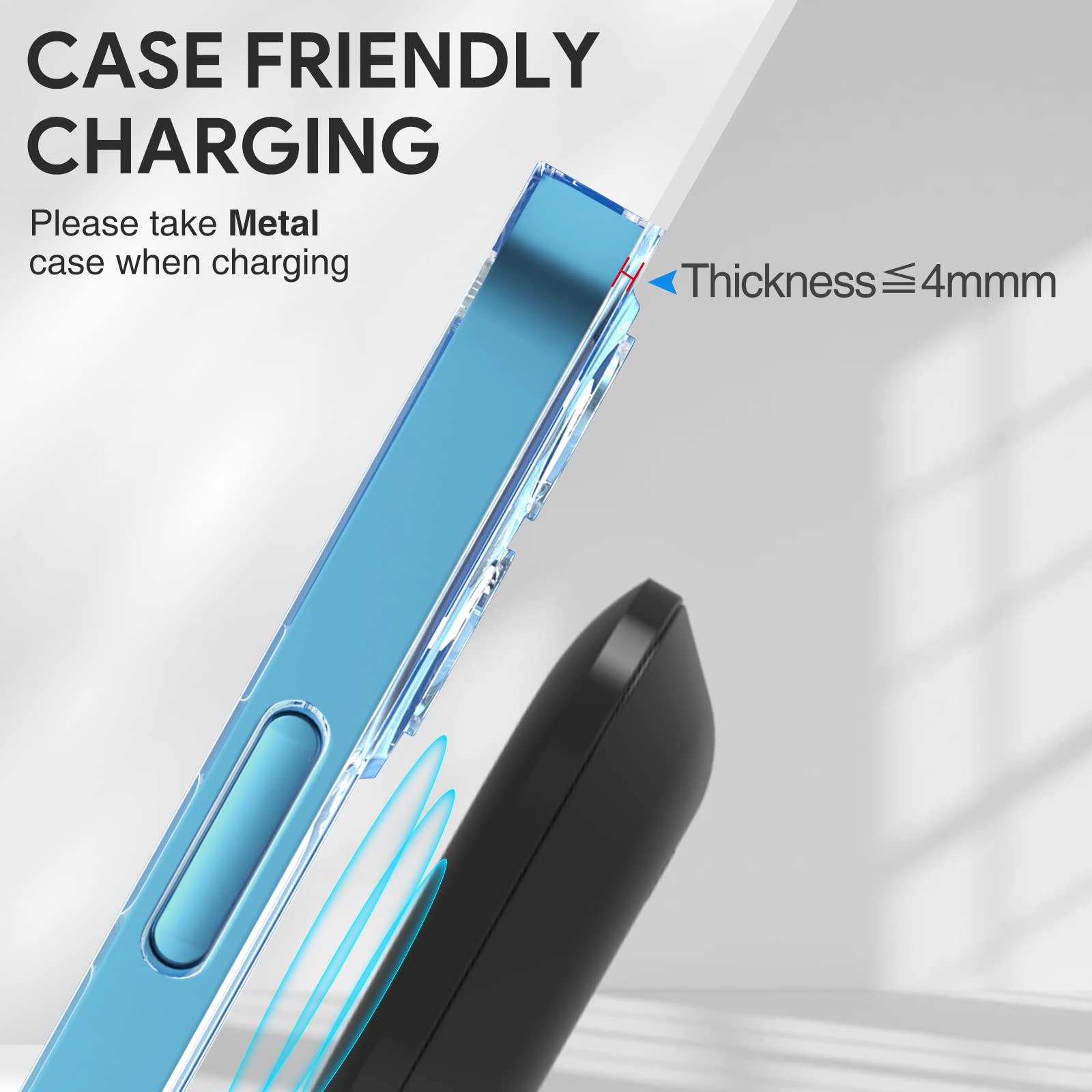 - ?Anti-Slip and Case Friendly Charger ?Wireless charging pad support to charge directly through cases, it works with rubber/plastic/TPU cases(?4mm). Metal phone cases cannot be used!!Phone watch airpods charging station is suitable for home and office,it is a perfect gift for family and friends. No one likes a wireless charger moves or flips during charging.The wireless charger station boasts non-slip silicone design for a firm grip to protect your phone.