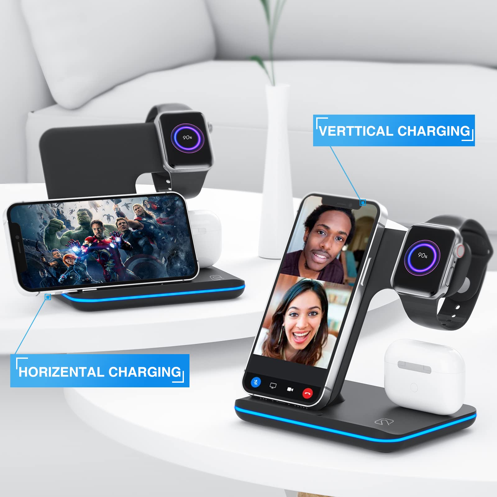 - ?3 in 1 Wireless Charging Station?The charging station can charge most phones, support charging for multiple devices apple at the same time, compatible with iPhone14/14 Pro/14 Pro Max13/13Pro/13 Pro Max/12/12 Pro/12 Pro Max/SE/XR/X/XS/XS Max/11 Pro Max/11 Pro/11/8 Plus/8; for Apple Watch 7/6/5/4/3/2/SE, for Airpods Pro/3/2/1. Advanced technology detects your devices,just put them on. Wireless charging stand will automatically start. Easy charging,comfort life.