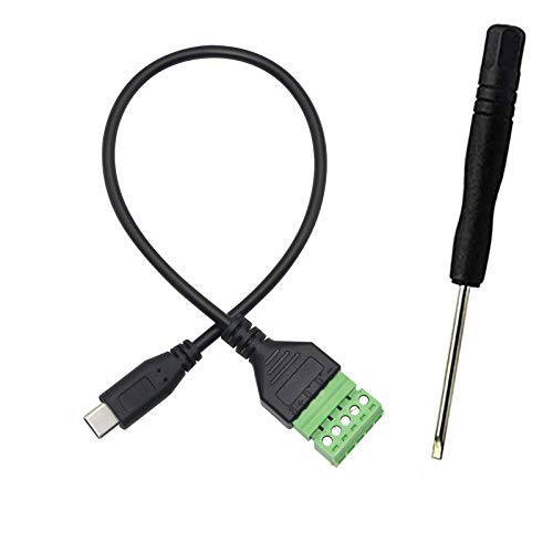 Pluggable design TerminalsPluggable design terminal for flexible switching of all USB 2.0 solderless wires without rewiring5-pin (way) bolt screw terminal pluggable connector can be plugged into the typec plug, Then connect the socket to the other wires, The length of the typec cable can be extended.Detailed wiringThere are two ways for wiring the solderless usb c extension, connecting with or without shielded wires..ow the tips provided by the head to connect one by one. After confirming that it can be used normally, seal it with electrical tape to avoid leakage.1 screwdriver is included, no need to prepare additional screwdriver, which really saves time and effortWiring NotesWhen wiring the screw terminal connectors, just loosen the top screw of the terminal and put it into the corresponding cable (you need to open the outside and put it into the copper wire part inside)Screw Termainal Line descriptionS : Shielded wire+ : Positve dlectrode(Red)D- : Data(White)D+: Data(Green)- : Negative electrode(Black)v ?Please connect in the above order)Product Specification1, Product function: data transmission, charging extension function2, Product Plug: USB 2.0 type c male3, Product terminals: 5P pluggable screw terminals screw connector USB shielding cover4, Product Material: Copper5, Product Line Diameter: OD4.0mm6, Cable Length: 30cm7, Wiring Mode: solder free, terminal screw fixing Applicable8, Compatitive Cell Phones, PC, Notebook, and other interface devices with USB TypeCPackageUSB C Male to 5P Solderless Terminal cable*1Screwdriver*1