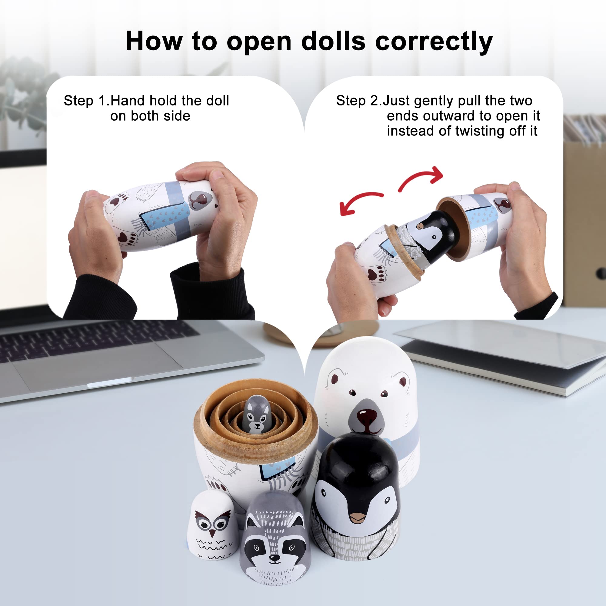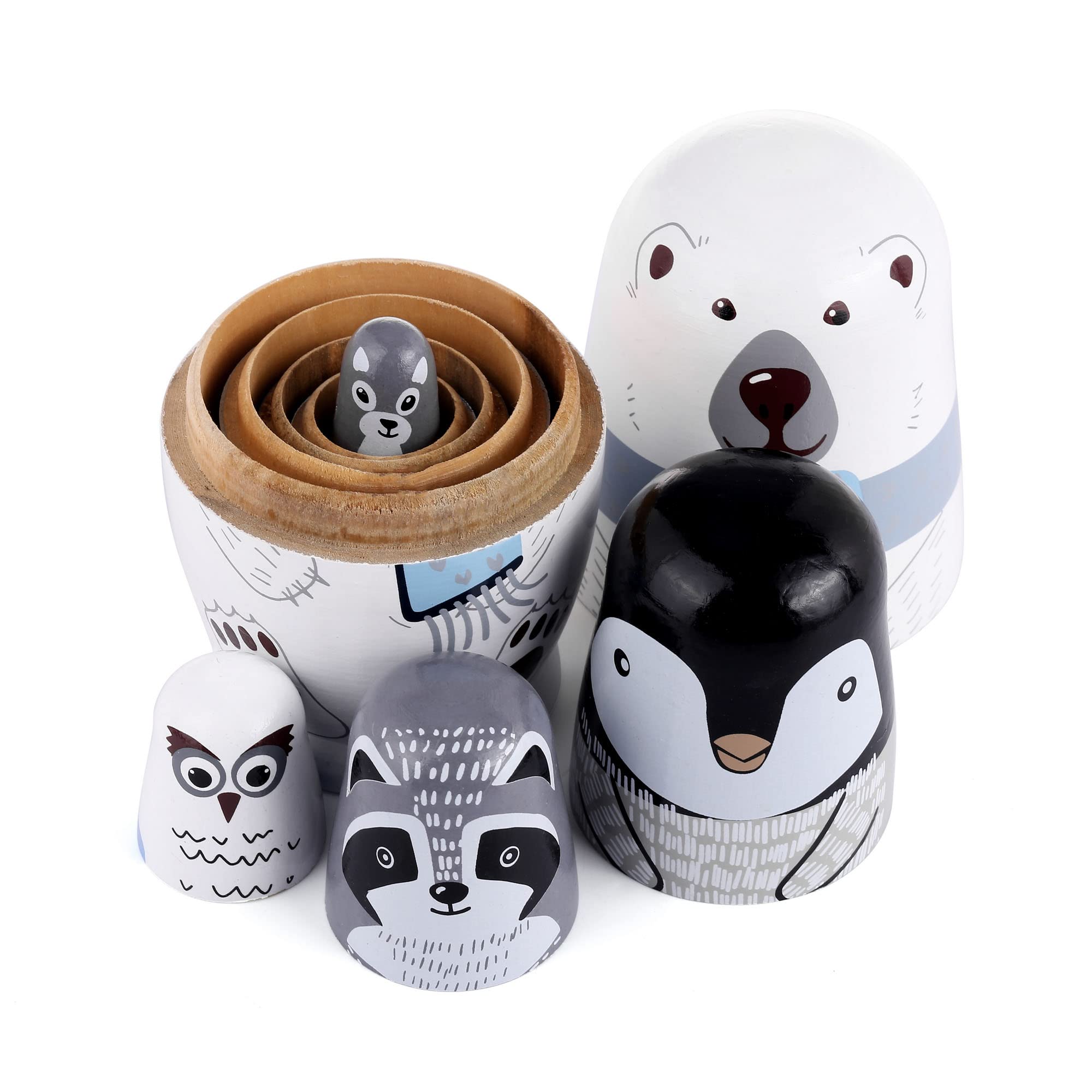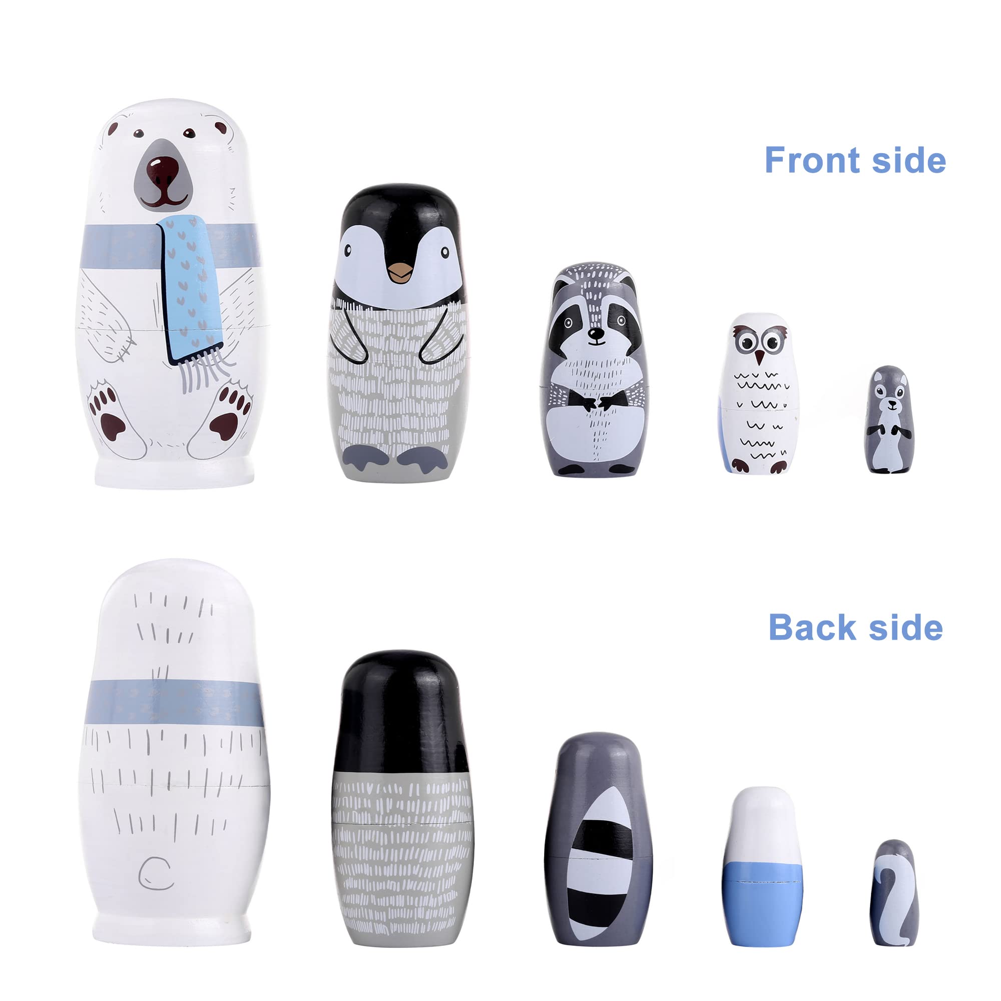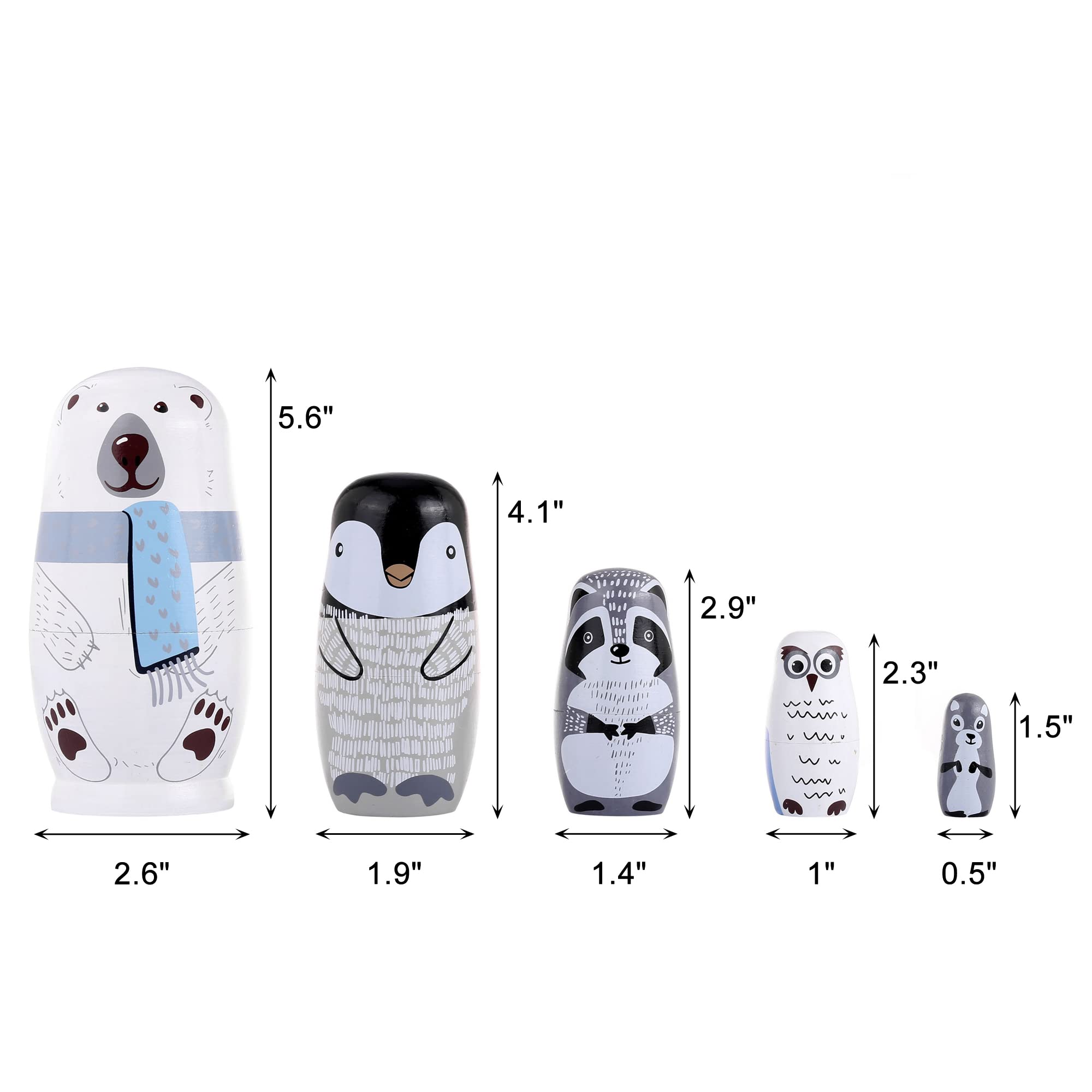 - PACKING INCLUDES: 5 pack different size nesting dolls (polar bear, penguin, owl, mole, raccoon).