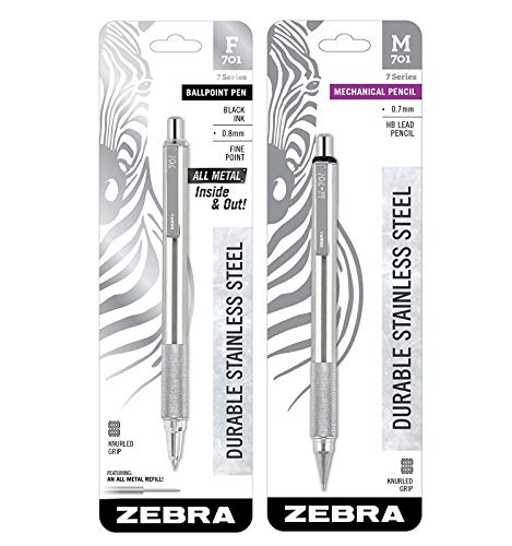 Zebra F-701 Stainless Steel Ballpoint Retractable Pen, Black Ink, .8mm Fine Point and Zebra M-701 .7mm Pencil Set