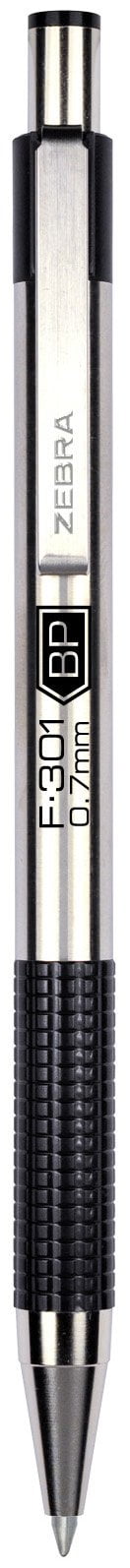 Zebra Pen F-301 Retractable Ballpoint Pen is sleek, sophisticated and easy to sanitize. This hard-working metal pen brings industry-leading precision and stability to your writing. The refillable F-301 has a metal plunge, clip and cone for an executive look. Retractable ballpoint pen has black ink and a 0.7mm fine point tip. Corrosion resistant, stainless steel barrel is easier to sanitize than plastic. Shorter barrel slips easily into shirt pockets. Comfort grip matches barrel accents. Metal clip readily attaches to a notebook, planner, work bag or briefcase pocket. This 12-count pack of attractive pens is perfect for home, school or office. Clean and stylish, this trusted pen is suitable for boardrooms, courtrooms, classrooms, medical settings, offices and job sites. It?s the right pen for any job.