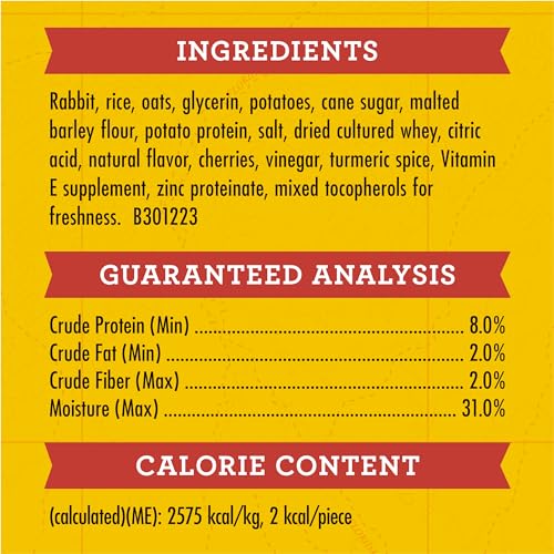 - Real rabbit is the first ingredient in these soft dog treats for small dogs, medium dogs, and large dogs. These snacks are made with natural ingredients like real rabbit and cherries