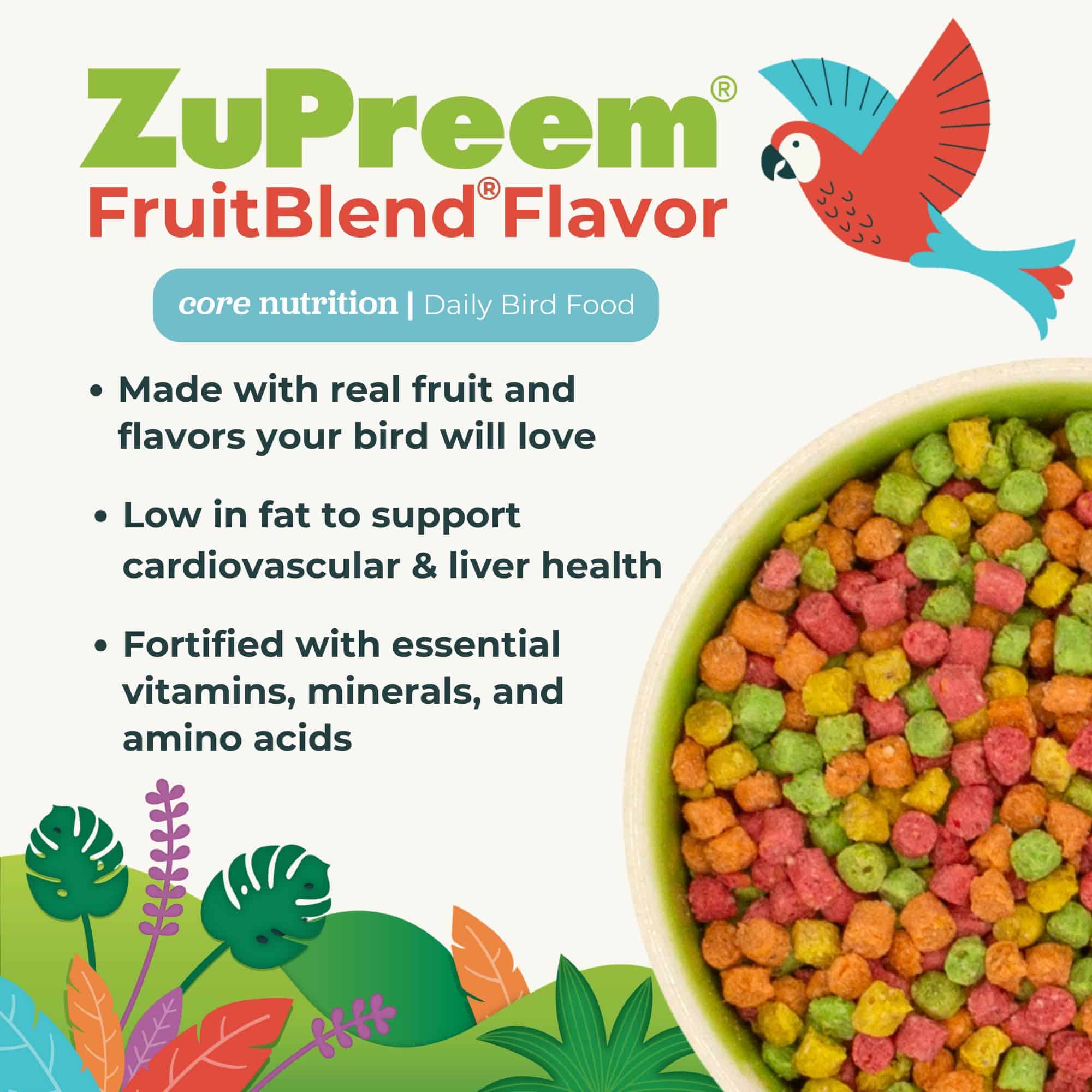 ZuPreem FruitBlend Flavor with Natural Flavors is one of the most popular pelleted pet bird foods in the U.S! FruitBlend contains natural flavors your bird will love and helps support a healthy daily food program. FruitBlend contains 21 essential vitamins and minerals birds need daily and is suitable for very small pet birds.